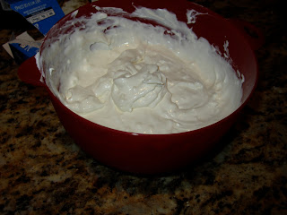 Then you will add your 8 oz of cream cheese and whip it with 1/4 cup sugar. Once whipped you will fold in about 3/4 of your cool whip. Try to whip it enough to where there is few bumps.