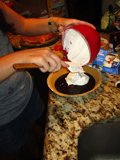 First you will start with your pie crust and your hot fudge sauce. Remove the lid and heat your fudge sauce in the microwave for 45 secs to 1 min. Then you will add it to your pie crust. ONLY use about 3/4 the jar.